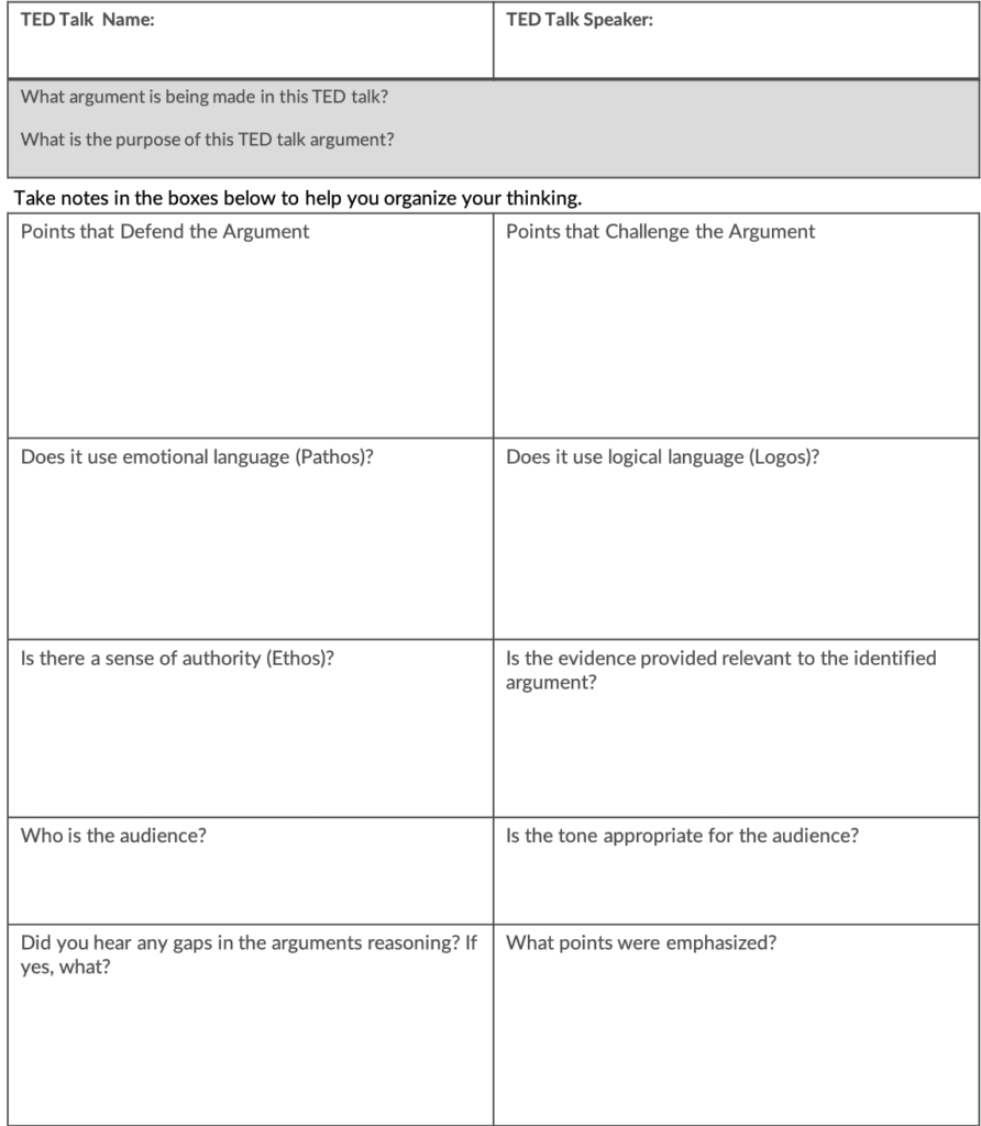 Use the following graphic organizer and questions to assist you during watching the TED Talk videos in order to gather your thoughts for your persuasive argument writing.