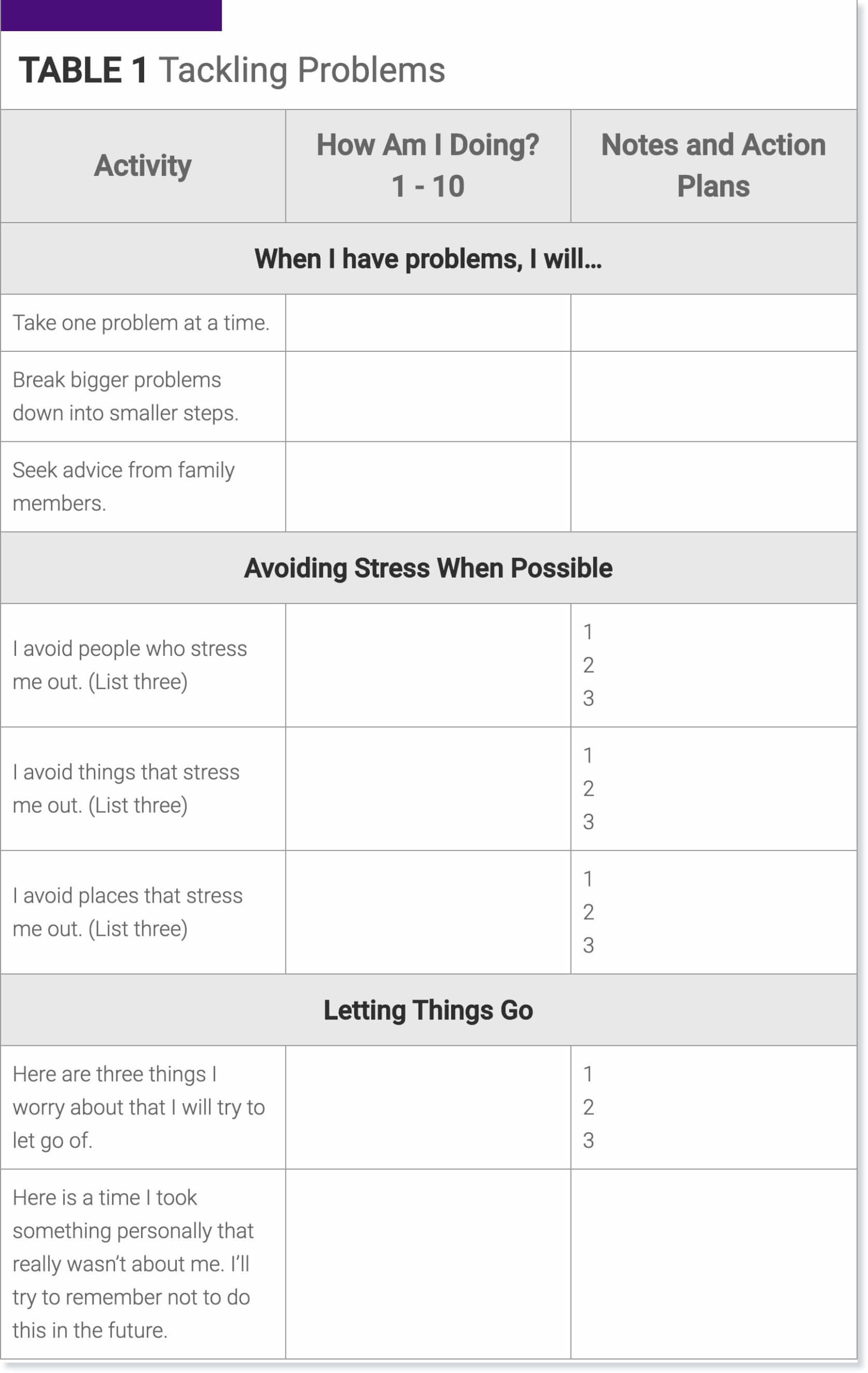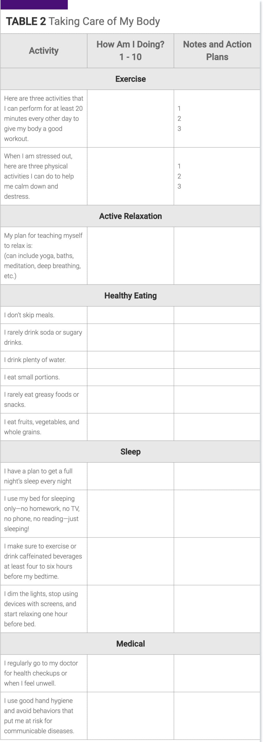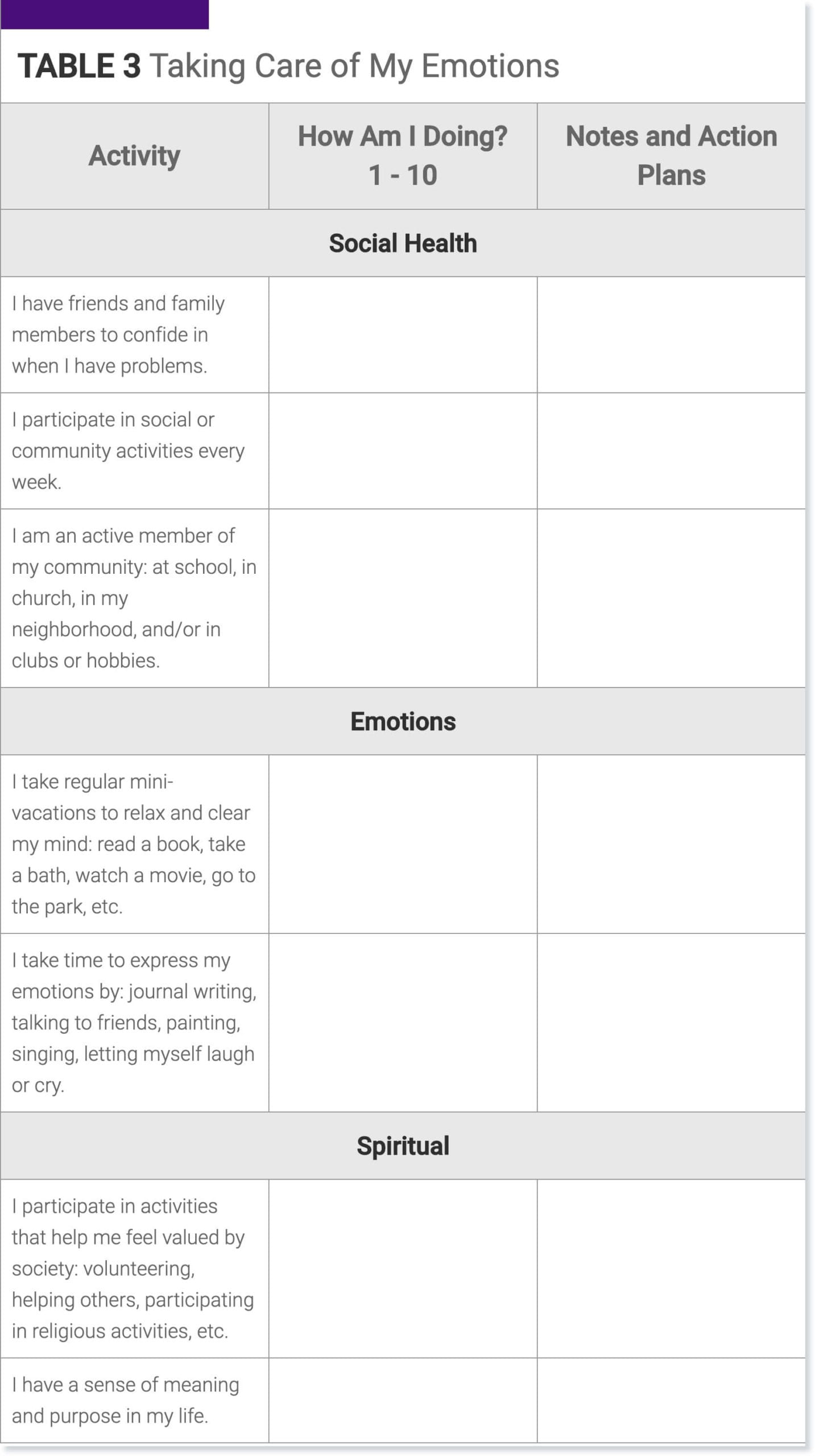 It’s time to put your knowledge to work to help you create a wellness and stress management plan that will work for you. This will require that you think deeply about yourself and your habits and be willing to be honest about the areas that you can improve on. For each item on the list, rate where you are at today on a scale of 1-10, with 10 being terrific and 1 being needs work. Make sure to include details of each item in the “notes” column. Here, you can note things that you already do to take care of yourself, or you can detail an action you plan to take to address this item.