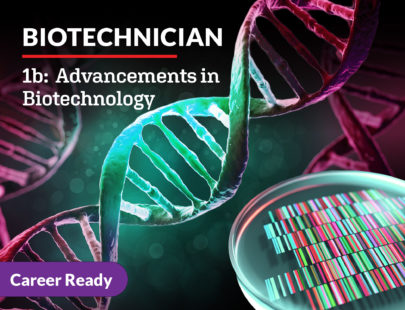 You’ve examined the DNA of the biotechnology field, and now have a solid understanding of the day-to-day duties. In this course, you will build on the basics and learn how a career as a biotechnician could change the world! You will explore genetics- diseases, therapies, and testing, AI and precision medicine, CRISPR and agricultural sciences, and much more. You will also explore job opportunities in the field of biotechnology and tips for planning a career. Get ready to engineer your understanding of biotechnology!