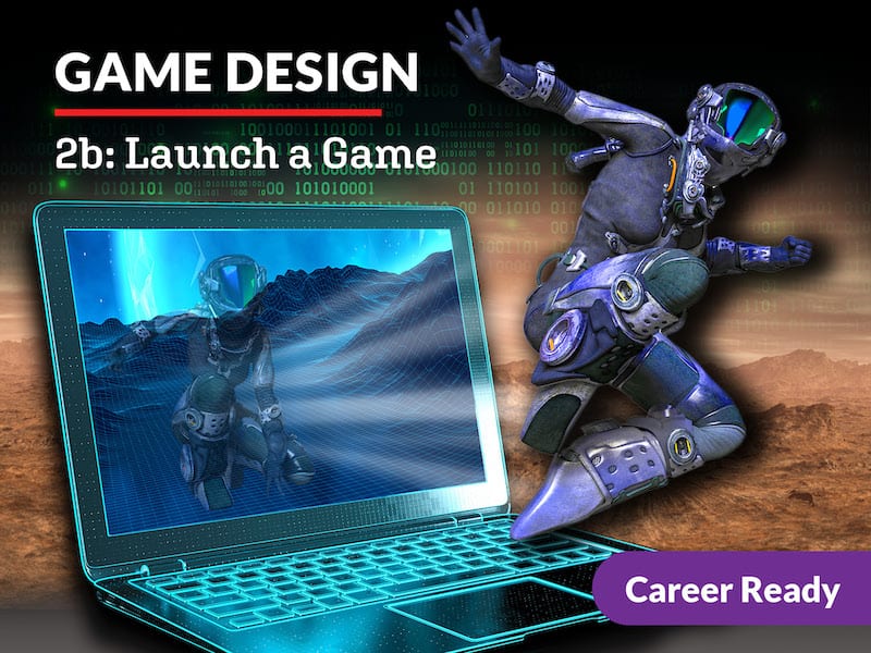 You’ve already done the groundwork, and now it’s time to level up and launch! In Game Design 2b, you’ll take your runner game to new heights and enter the land of fire and ice using the cool tools that Unity has to offer! Get ready to build atmospheric landscapes, mountain runs, stair builds, and implement obstacles to keep your relic safe! Then, your real-world game begins: test and evaluate your game and prepare for a market launch! All of the moving parts of the game development process come together in this course, so you can unleash your game into the world!