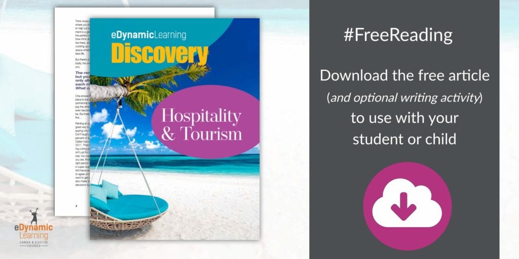 April 20, 2020Get students exploring careers in hospitality and tourism! The following article and optional activity is part of our 10-day, Discovery article series. The articles provided are exclusive content of eDynamic Learning provided for teachers and students to read expository text around various topics that are geared towards high school students. The optional, follow-up lesson activity is a way for students to extend their exploration of expository writing essays as they are a requirement for K-12 students, as outlined by the standards.