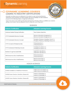 eDynamic Learning offers many popular Career Ready courses that are designed to prepare students for industry certification exams after just one year of coursework. After completing these courses, students are eligible to take the certification exams listed on this flyer.