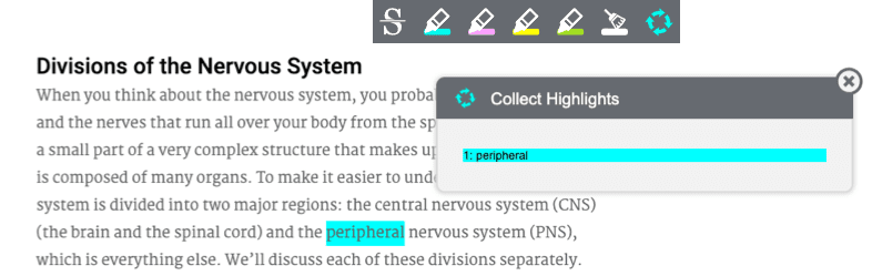 Using the recycling icon, students can create a study guide by gathering all highlighted and strikethrough text and copying and pasting it into a Google or Word document. Collected highlighter colors remain intact during the copy and paste process, and strikethroughs appear as plain text.