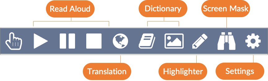 Simplistic icons represent the various literacy support functions students can leverage on the toolbar. Included is a settings feature that allows students to personalize the different features to best meet their needs.
