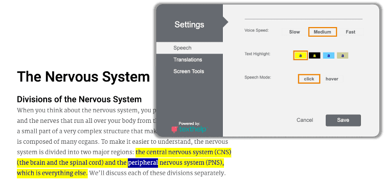 Students may encounter complex vocabulary in their secondary years. Using the dictionary option, students stay engaged even when they come across words they may not understand. Students highlight the word and choose the dictionary button to get the definition. They can optionally have the word read to them to help with pronunciation. And, the pictionary option will provide an associated image if one is available. These features are especially beneficial to students when they’re learning complex career terminology.