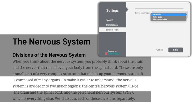 A screen mask option allows students who may be easily distracted or struggle with reading to focus on one line at a time. Screen mask overlays reduce visual stress on students with reading challenges; including students with dyslexia and other learning disabilities.
