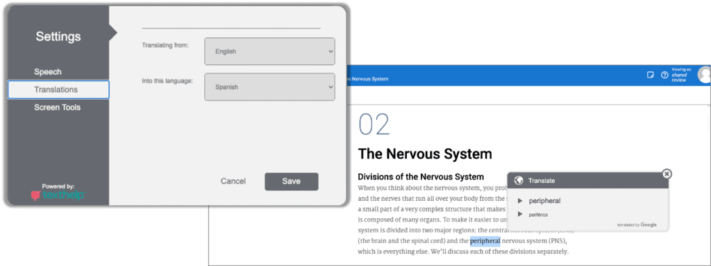 English Language Learners (ELL) students and students taking foreign language classes will love the translation feature! The Literacy Support Toolbar allows learners to select the words or phrases they want to be translated and/or read aloud in over 90 languages! The translation option promotes continuous learning by giving ESL students the support they need when they need it by reducing language barriers.