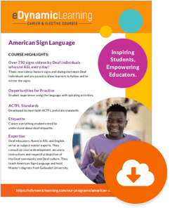 eDynamic Learning’s ASL courses have been developed with deaf educators who teach American Sign Language, hold Master’s degrees from Gallaudet University and are fluent in ASL and English. American Sign Language is complex and robust, consisting of signs made with the hands, facial expressions, and body postures. Since sign language is a visual language, students are given access to hundreds of videos which feature signs and dialogs between Deaf individuals that are paced to allow learners to follow and to mirror the signs.