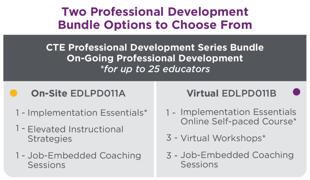 eDynamic Learning supports Perkins’ definition of professional development through a succession of three workshops. Teachers will collaborate and learn best practices to support their students effectively in CTE through job-embedded, data-driven, and classroom-focused workshops. Sessions will help strengthen teachers’ understanding of the curriculum, resources, and the instructional strategies.