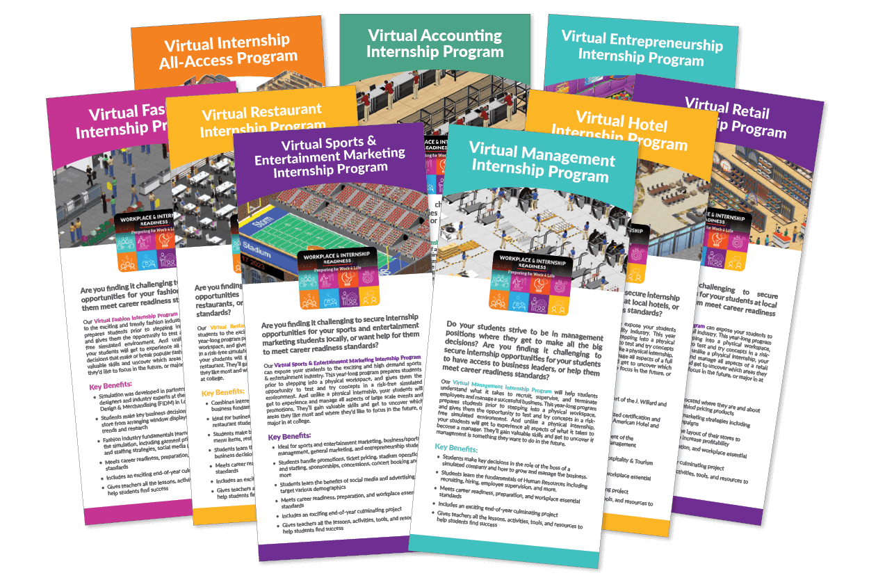 This year-long program is designed to prepare students prior to stepping into the workplace. It gives them opportunities to test and try concepts in a game-like simulation. And unlike a physical internship experience, your students will get to experience and manage all aspects of how a business runs. Let your students uncover which areas they like most and wish to focus on in the future with one of our 8 Virtual Internship Programs.